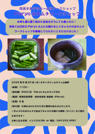 夏の疲れがどっと押し寄せてくる残暑に韓国伝統料理や保存食を研究されている島田梢さんにお願いをしてワークショップを開催していただくことになりました!韓国での食についてのお話など、目から鱗がポロポロおちます。是非ご参加お待ちしております。